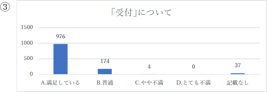 今回いただいたご要望は院内で共有し、改善に努めてまいります。自由記載をいただいた点はすべてを反映できないかもしれませんが、今後の長期的なビジョンには生かしていきたいと考えています。 ご協力ありがとうございました。